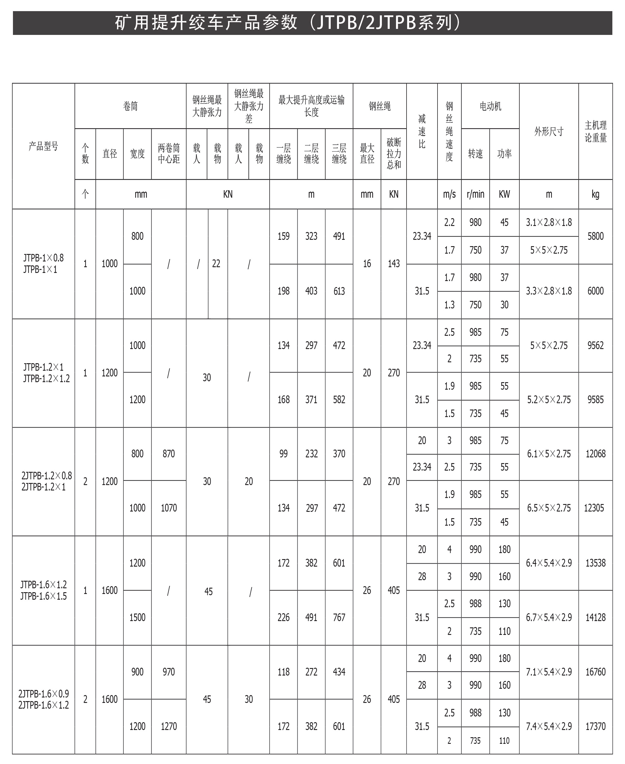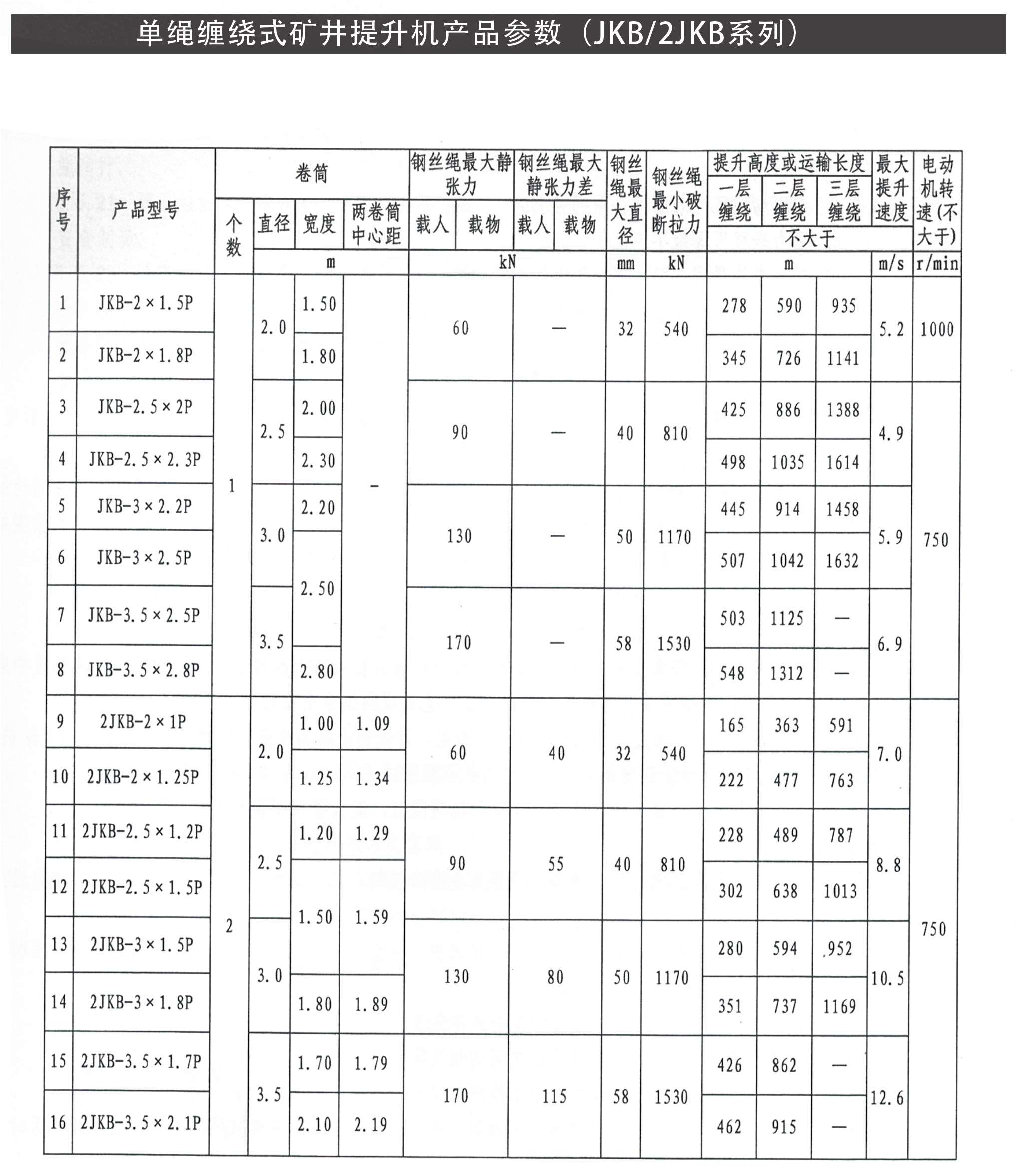 单绳缠绕式提升机的型号的含义 :例: 2.5米双滚筒提升机的型号为:2JK-2.5×1.2P 2-双滚筒(单筒时为1,略去不写) K-“矿井”汉语拼音字母的字头。 J-“卷扬机”。 2.5-卷筒名义直径为2.5米。 1.2-卷筒两挡绳板间宽度为1.2米。 P-交流电控; Z-直流电控。 D-电控系统采用开关磁阻调速;电阻调速不标 目前具有单滚筒和双滚筒 2个系列、43个规格的产品,大规格直径4米, 还可根据用户需要定制。 |